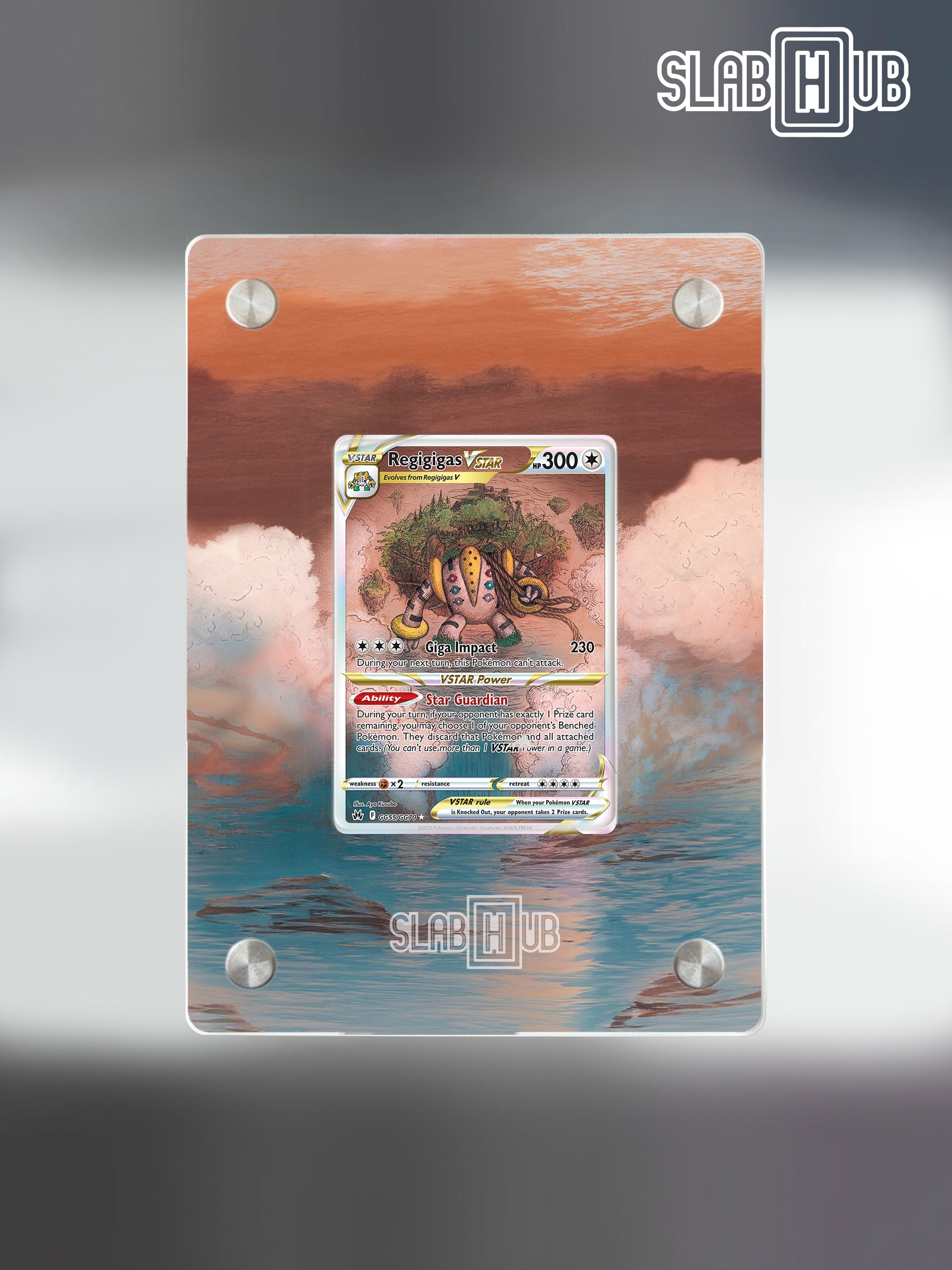 This piece is a faithful visual extension of the card Regigias V CRZ GG55/GG70 - Sword & Shield - Crown Zenit (Japan version: s12a 233/172 VSTAR Universe; Chinese version: CS6bC 157/131 Azure Shadow - Pursuit), designed to blend seamlessly with the slab you own. The composition enhances the card’s energy, color, and identity — turning it into a refined fusion of collectible culture and wall art.