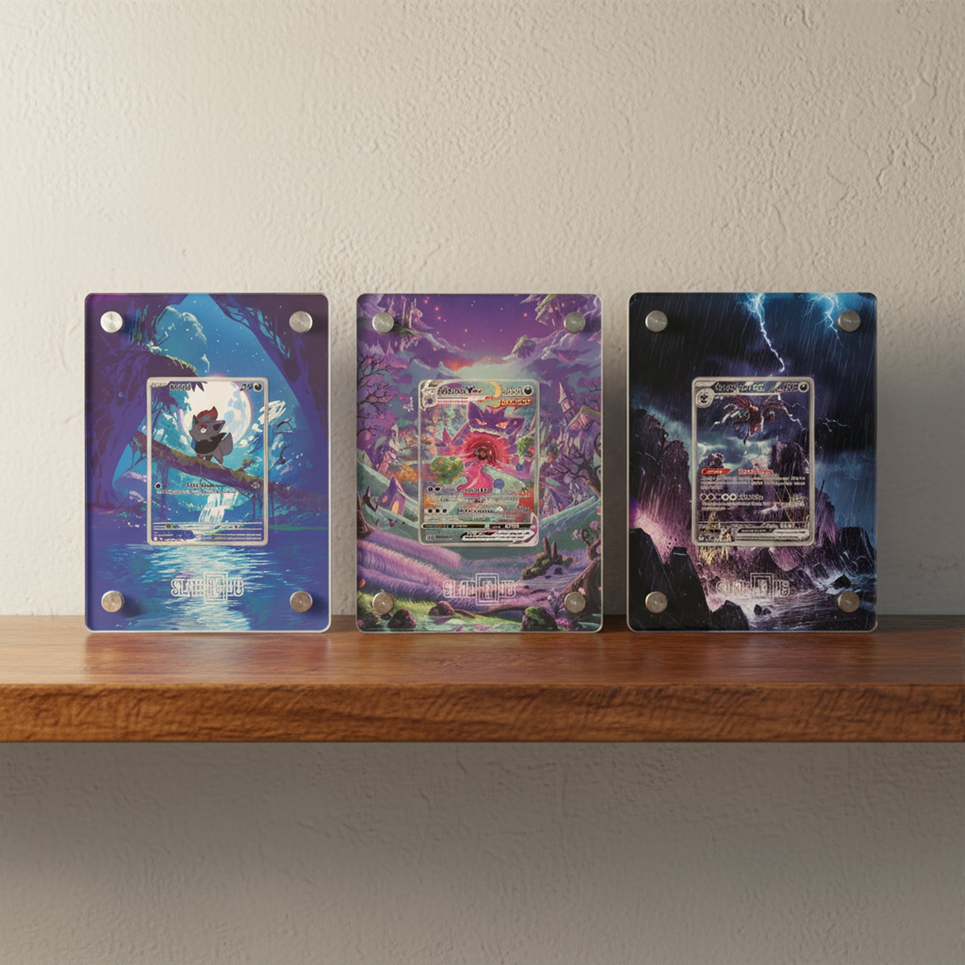 Featuring cards from White Flare and Fusion Strike, each Slab transforms the original artwork into a hauntingly beautiful display. When combined, the trio forms a visual symphony of darkness and energy β a perfect blend of eerie atmosphere and collector elegance.