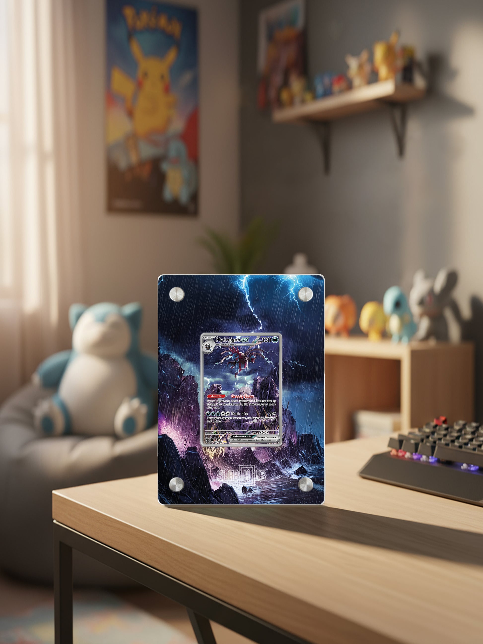 This piece is a faithful visual extension of the card Hydreigon ex WHT 169/86 Scarlet & Violet - White Flare (Japan version: sv11W 171/086 White Flare JP), designed to blend seamlessly with the slab you own. The composition enhances the card’s energy, color, and identity — turning it into a refined fusion of collectible culture and wall art.