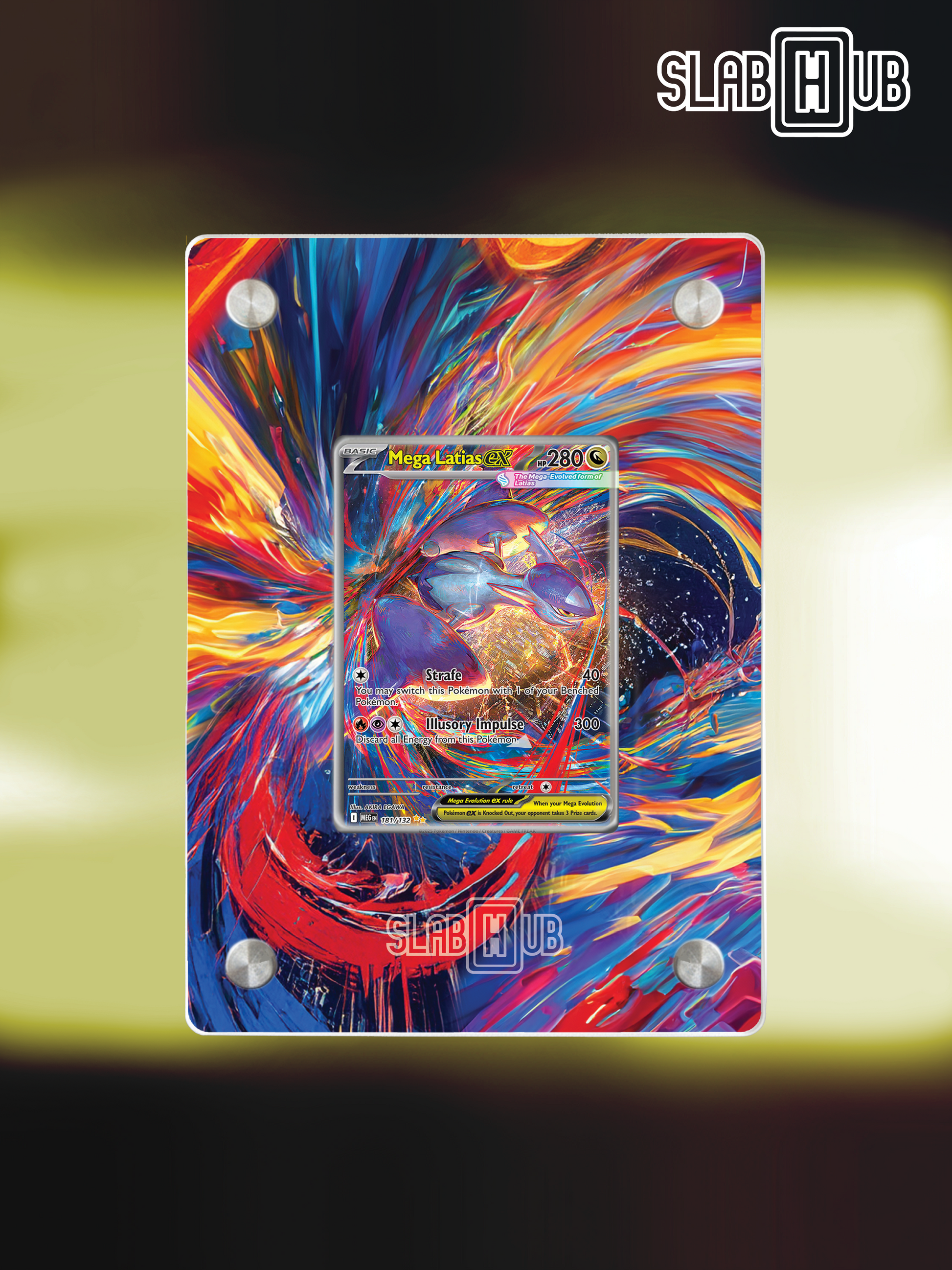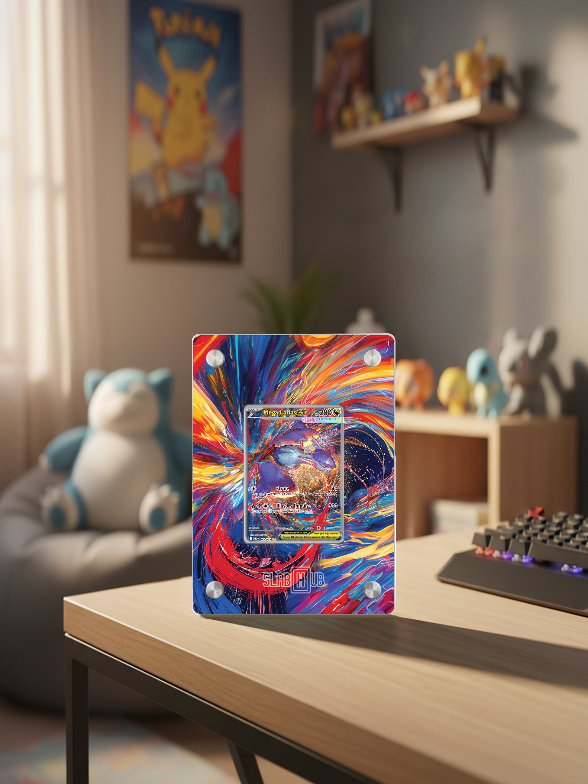 This piece is a faithful visual extension of the card Mega Latias ex MEG 181/132 - Mega Evolution (Japan version: m1S 088/063 - Mega Symphonia), designed to blend seamlessly with the slab you own. The composition enhances the card’s energy, color, and identity — turning it into a refined fusion of collectible culture and wall art.