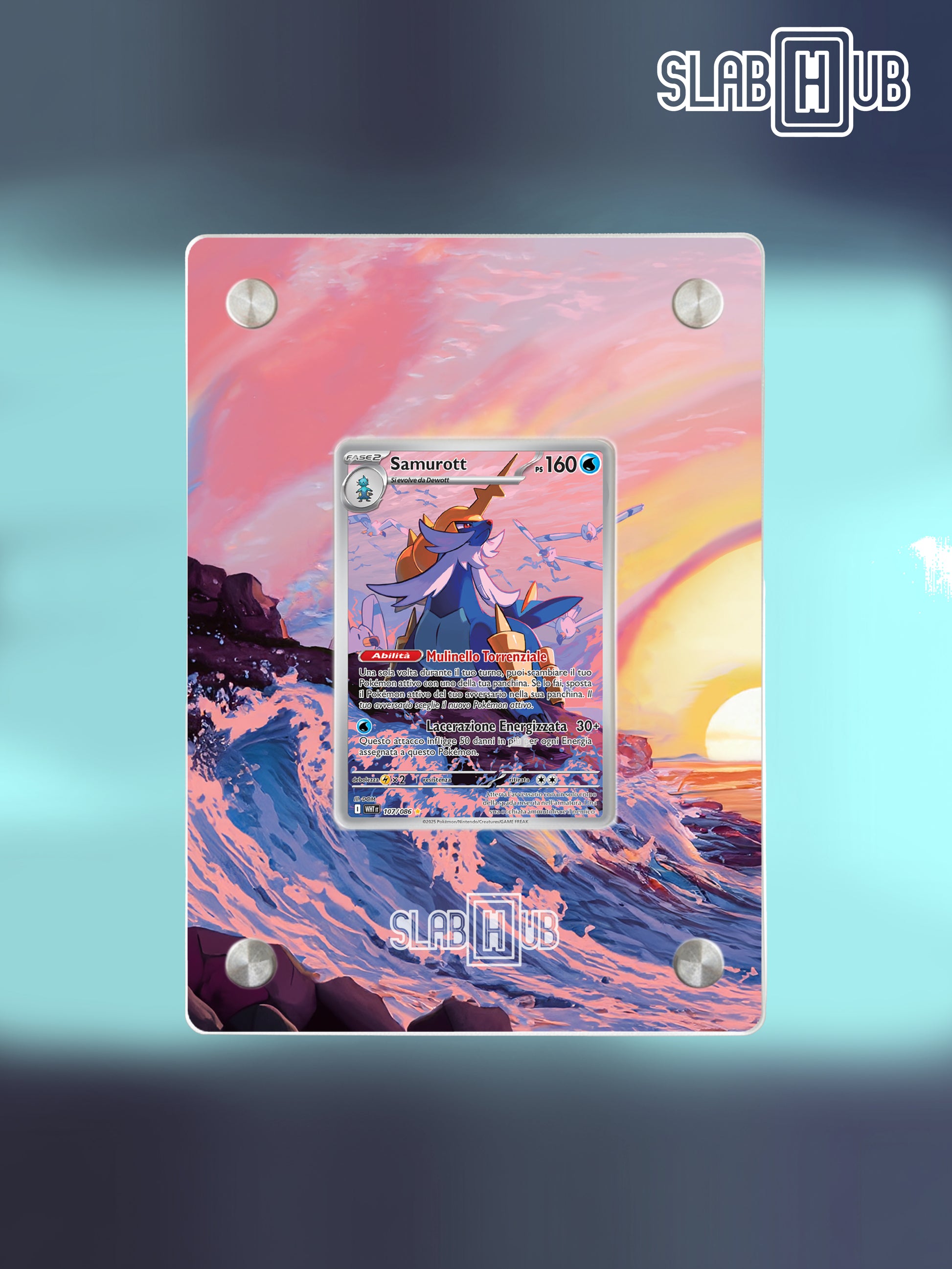 This piece is a faithful visual extension of the card Samurott WHT 107/86 Scarlet & Violet - White Flare (Japan version: sv11W 104/086 White Flare JP), designed to blend seamlessly with the slab you own. The composition enhances the card’s energy, color, and identity — turning it into a refined fusion of collectible culture and wall art.